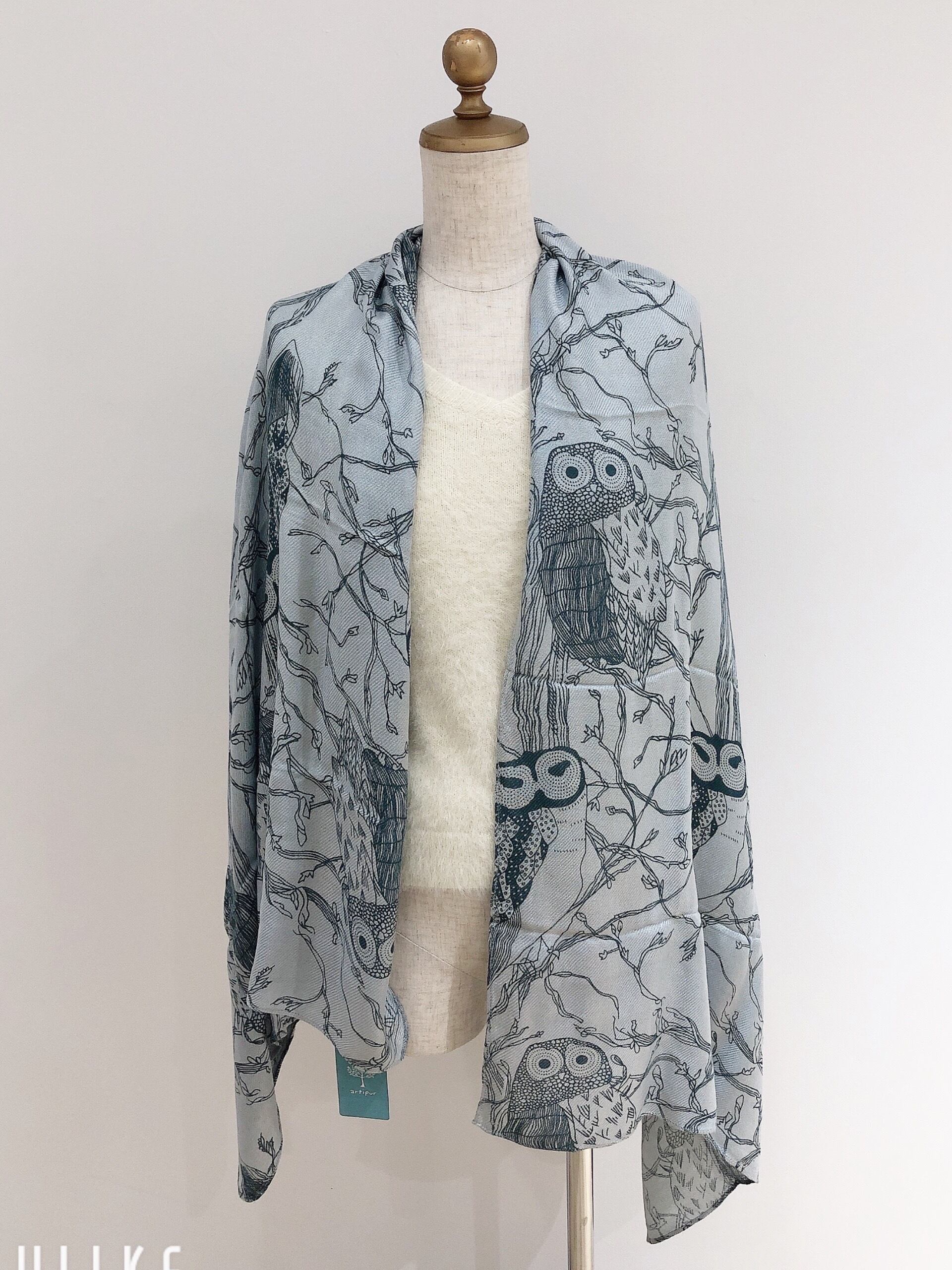 グレー地にグリーンとベージュ地に茶色の縁起の良いフクロウ柄です。